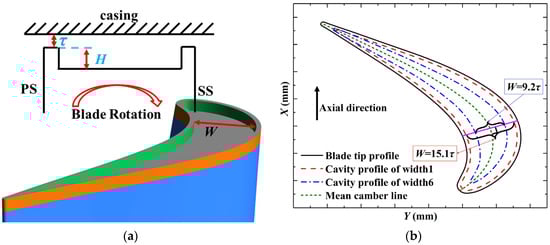 The geometric sketch of cavity squealer tip and the definition of cavity width are shown in Figure 1. Here, the direction of TLF is approximated by the normal direction of the mean camber line. The width of the cavity is measured along this direction. Since the width of the cavity varies along the axial direction, the maximum cavity width (W) is adopted in this paper to characterize the width of the entire cavity.