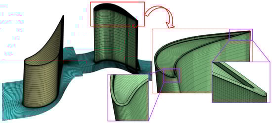 According to the numerical results, the variation in turbine stage efficiency (Δη) and the normalized tip leakage flow rate (mleakage) are presented in Figure 3. Here, Δη is the difference between the turbine stage efficiency of each case and that of Grid 6. In this paper, the turbine stage efficiency is the isentropic efficiency of turbine, which is defined as []: