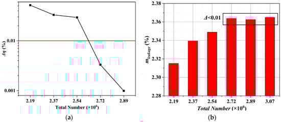 Aerodynamic parameters of cases with different grid numbers: (a) Variation in turbine stage efficiency; (b) Normalized tip leakage flow rate.