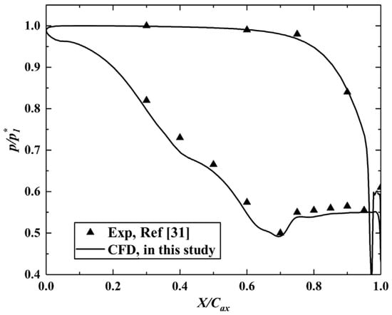 The pressure distributions of blade tip section (90% span) obtained by numerical simulation and experiment are presented in Figure 4. The numerical results and experimental are in good agreement. In the region close to the APG, the boundary layer separation could occur [,]. In particular, the good agreement near the 0.7 Cax indicates that the numerical method in this study could accurately predict the separated flow under the adverse pressure gradient. In general, the numerical method and results in this study are reliable.