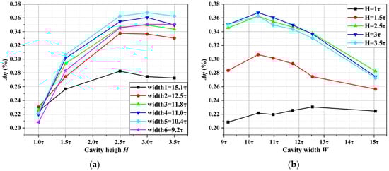 Six kinds of cavity widths, named ‘width 1’–‘width 6’ in decreasing order, and five cavity heights, are investigated. The maximum width of cavity is 15.1 τ, 12.5 τ, 11.8 τ, 11.0 τ, 10.4 τ, and 9.2 τ, respectively. The height of cavity (H) is 1.0 τ, 1.5 τ, 2.5 τ, 3.0 τ, and 3.5 τ.