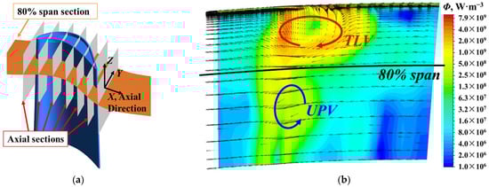 It is well known that the tip geometry mainly affects the flow field and loss of the upper half span of the rotor blade. Therefore, in this paper, the dissipation function Φ in the region over 50% span of different axial sections are integrated, as presented in Figure 6a. In addition, the upper half blade span could be divided into two regions, which are dominated by TLV and upper passage vortex (UPV), respectively, as shown in Figure 6b. The boundary between the two regions is about 80% span.
