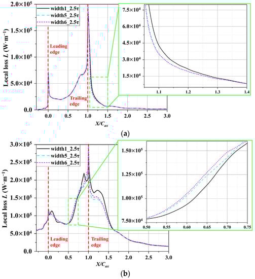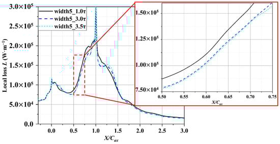 First, the distribution of local loss along the axial direction in the range of 50–80% span is presented in Figure 7a. In the channel (0.0–1.0 Cax), cavity width has few effects on the loss in the range of 50–80% blade span. In the early stage of the formation of TLV, most of the TLF is involved in the TLV, which is difficult to have a significant impact on the flow field and loss in the range of 50–80% blade span. Downstream of trailing edge, UPV dissipates rapidly under the influence of the adverse pressure gradient (APG) near the trailing edge. Thus, the loss decays rapidly at the 1.0–1.5 Cax. In addition, the interaction between TLV and UPV in this axial range is obvious, and the mixing loss in this region will change significantly with the variation in TLV. This is why there are obvious differences in the losses of the three cases with different cavity widths in this axial range. When the cavity width changes from ‘width 1’ to ‘width 5’, the loss decreases significantly, which means that the mixing between TLV and UPV is weakened. This is most likely caused by the weakening of TLV.