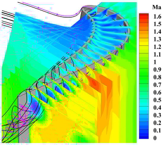 To reveal the mechanisms of loss in the tip region downstream of trailing edge, Figure 8 illustrates the distribution of Mach number on different sections in the tip region, as well as the streamlines. The Mach number downstream of the throat drops sharply under the effect of shock wave. Downstream of the shock wave, the backflow of the fluid in the TLV core implies the breakdown of TLV. The breakdown of TLV could cause extra mixing loss inside the vortex core [].