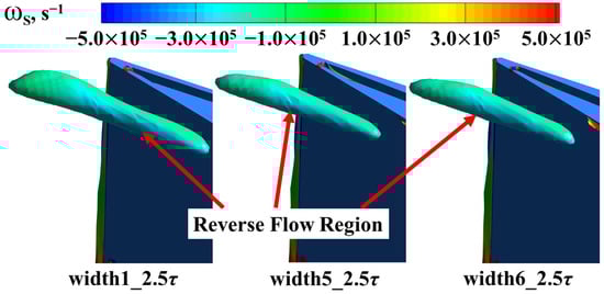 The starting location, ending location and axial length of reverse flow regions are summarized in Table 3. From ‘width 1’ to ‘width 5’, the axial length of reverse flow region is reduced significantly, which indicates that the TLV breakdown is restrained. Correspondingly, the loss in the range of 1.0–1.5 Cax is reduced sharply, as shown in Figure 7b. When the cavity width is less than the value of ‘width 5’, the inhibiting effect of decreasing the cavity width on the TLV breakdown appears obvious as marginal effect, and the corresponding loss has only a small change.