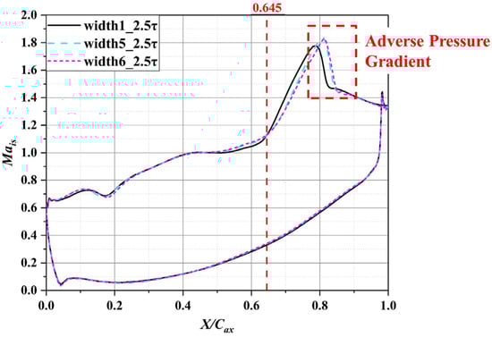 To measure the APG, Figure 10 shows the isentropic Mach number (Mais) distribution at 95% blade span, which reveals the effect of cavity width on blade loading. The isentropic Mach number is defined as []: