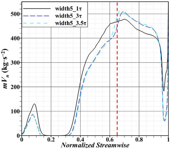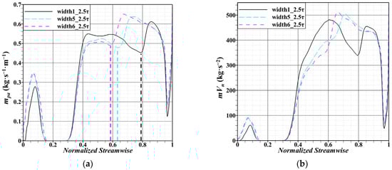 The corresponding positions of the three troughs (black dash line) of leakage rate per unit area (mpa) in the figure are exactly the positions where the SVs disappear. Before the SV disappears, the distance between the SV and the suction side rim will decrease gradually, enhancing the blocking effect on the TLF and diminishing the leakage rate. After the SV has disappeared, the sealing effect decreased sharply and the leakage rate increased rapidly. It can be found that at the upstream of 60% streamwise position, the leakage rate decreases with the decrease in cavity width. Figure 12b shows the distribution of normal momentum (mVn) of TLF along the streamwise direction. The distribution characteristics of normal momentum are affected by the SV inside the cavity and similar to that of leakage rate. Therefore, it is proved that the decrease in the cavity width could improve the blocking effect on the TLF in the front section of the cavity.