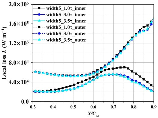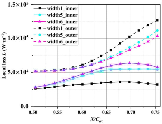 Combined with the above analysis, theoretically, the mixing loss caused by TLF should decrease with the decrease in cavity width, while the loss distribution at the position of 0.5–0.75 Cax in Figure 7b shows that this is not the truth. In the further analysis, the loss inside and outside the clearance is distinguished and presented in Figure 14. Thereinto, the local loss inside the clearance is calculated by integrating the dissipation function Φ over the region inside clearance shown in Figure 13. Moreover, the loss outside the clearance is another part of the loss in the area above 80% span except the loss inside the clearance. The mixing loss outside the clearance decreases with the decrease in cavity width, while the mixing loss inside the clearance increases significantly, leading to the increase in the total loss in the channel at this axial region.