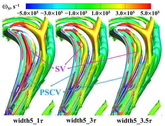 The vortex structures inside the cavity are shown in Figure 11. Here, vortices are identified by the Liutex method and visualized using Liutex iso-surface (Liutex = 4 × 104). The iso-surface is colored by streamwise vorticity (ωS) to reflect the strength of shear visually. The SV could form an aero-labyrinth like a sealing effect on the TLF and is the most noteworthy vortex structure in the cavity []. With smaller cavity width, the distance between the SV and the suction side rim in the front part of the cavity decreases obviously. The blocking effect of SV on TLF is essentially caused by the interlocked labyrinth seal structure formed by SV, suction side rim and pressure side rim. As an aero-labyrinth tooth, the SV is close to the suction side rim, which is equivalent to the reduction of the spacing between labyrinth teeth, blocking the TLF better. Therefore, with smaller cavity width, the blocking effect of cavity on the TLF in the front part of the cavity could be enhanced.