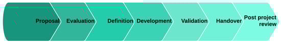 In this schematic, the first stage, the proposal, defines needs and opportunities, which form the basis of the project. The second step, evaluation, involves assessing the proposal’s merits concerning scope, time, cost, suitability and alignment with the ambitions of other projects, and policy/regulatory accordance [,]. Thirdly, the project is defined as a process of clarity building that assists in the minimization of risk [,] and pursuit of long-term sustainability goals []. At this stage, stakeholders are also identified and analyzed []. Development constitutes the fourth step, whereby the project is advanced through design, development, innovation, and creativity. Step five, validation, involves the testing and examining whether the project meets the objectives set out at the start of the design process. During handover, step six, the project is completed and passed on to those who will apply it, such as specific departments within the organization, individuals, customers, and management bodies. Step seven is a post-project review, during which lessons learned are reflected upon, and a critical examination of project success is conducted [,].
