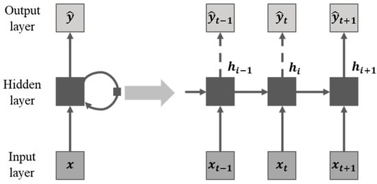 Recurrent neural network (RNN) is a very popular model used to solve forecasting time series because it can retrieve information obtained from time-series data []. The RNN develops the forecasting model based on the input in the current state and inputs from the previous states []. RNN extends an artificial neural network (ANN) that connects neurons in the same hidden layer [] the structure as illustrated in Figure 1.