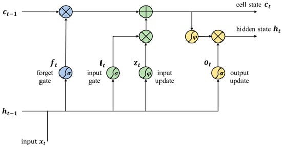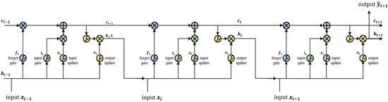 The LSTM model consists of several stages []. It starts by determining the information that can pass in the cell state. The decision is controlled by the forget gate for time , , as shown in Equation (15).