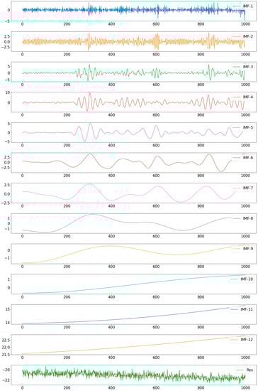The empirical mode decomposition (EMD) is a pre-processing method used for non-stationary data [], such as energy-time series data in buildings. Non-stationary data will be decomposed into several components named intrinsic mode functions (IMF) as illustrated in Figure 3 []. The EMD method shows its superiority in time series data forecasting []. Thus, the ensemble empirical mode decomposition (EEMD) was proposed to improve the EMD []. This method was created to overcome the mixing mode problems in EMD [,]. It also aims to extract the existing oscillation function []. Mode mixing is a problem that arises because one IMF component has a different signal scale or the same signal scale in different IMFs []. To bypass the mixing mode, EEMD follows the EMD steps on the original time series , to get a set of IMF added by Gaussian white noises. Then, the average from the IMF applies as the final decomposition result [].