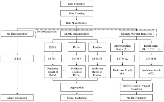 The proposed forecasting framework is developed based on LSTM with decomposition methods to improve the performance of the LSTM. There are three methods evaluated in this study. They are the LSTM without decomposition, LSTM with EEMD as the decomposition, and the LSTM with WT as the decomposition method. The LSTM without decomposition is the baseline for both EEMD-LSTM and WT-LSTM.