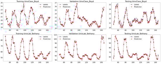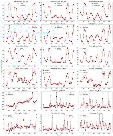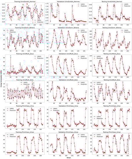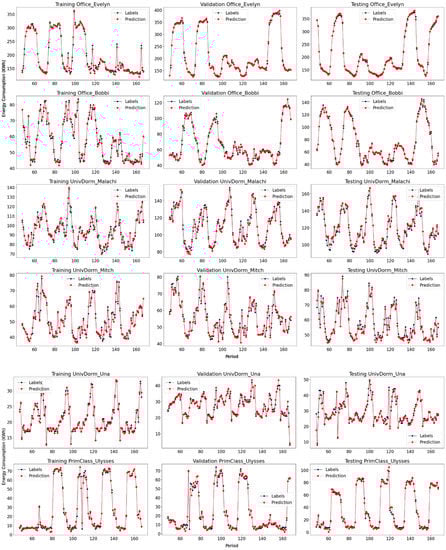 Buildings such as college classrooms and laboratories have more stable forecasting results with small errors than other buildings, followed by offices. Another building that has a high error is the primary/secondary classroom. It is caused by the fairly high distribution of data based on the buildings in that category. Stationary buildings such as UnivClass_Boyd, Office_Stella and PrimClass_Uma tend to have small and stable errors based on data stationarity. The UnivClass_Boyd has the smallest error among other buildings. Likewise, UnivDorm_Malachi is the only non-stationary building that has very small and stable errors in training, validation, and testing.