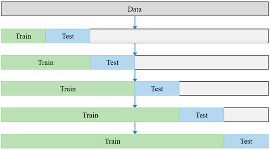 Based on Figure 4, the data are divided into two parts, training set and testing set . The training set is used to build the forecasting model after the WT step. The WT has two components, namely approximation, and detailed series. The approximation series captures the low-frequency features, while the detailed series captures the high-frequency features of the original data. The approximation series is a further decomposed process with WT. The high-frequency noise representing fluctuations and irregularities is extracted and filtered []. DWT consists of two basic components of wavelet functions, namely father wavelet and mother wavelet as shown in Equations (9) and (10) [].