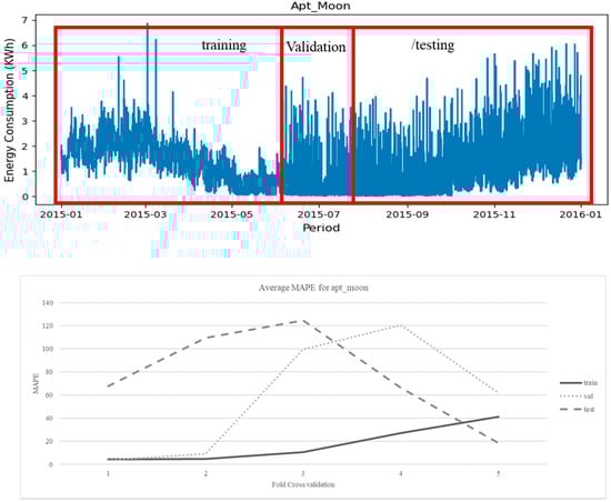 Based on the forecasting results, the apartments buildings consisting of Apt_Moon and Apt_Phobos have the highest error percentage rates in training, validation, and testing. This is caused by the raw data of the two buildings having an extreme slope, touching below 1 kWh. Those two buildings have the lowest level of consumption among the other two buildings in the same category. The uneven distribution of the raw data causes high errors during the forecasting process. Both buildings have significantly different data ranges in several periods. For several periods, the data are relatively stable, while at other periods significantly decreases. The forecasting model is generated based on the training set, which is relatively stable data, while the validation and testing set has a significantly different pattern. Therefore, the validation and testing errors are significantly higher than the training error. The result of five-fold cross-validation also shows that the average MAPE of the third fold has the highest value. At the third fold, the training and test set has a significantly different pattern as illustrated in Figure 9.
