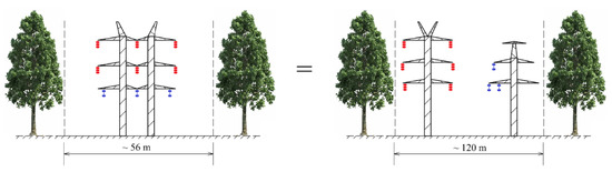 Dedicated supporting structures (towers) are used for multi-system, multi-voltage lines. The tower is designed for a given multi-voltage line. In most cases, these towers are taller than standard poles intended for one voltage level. The dimensions of the structure result from the necessity to maintain appropriate insulation gaps between individual current circuits [24]. Compared to standard designs, however, the differences are small. The main difference is the area covered, as it is of great importance in order to reduce the occupied technological belt. The width of the technological belt for two high voltage overhead lines is significant and almost twice the width of the technological belt occupied by a three-circuit double-voltage line with a vertical arrangement of working conductors [3]. This proves the suitability of using multi-circuit, multi-voltage lines when implementing investments for a new line (Figure 2).
