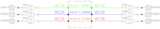 - Circuit III-single-circuit overhead line with a rated voltage of 110 kV supplied from the EKW2A and EKW2B equivalent.