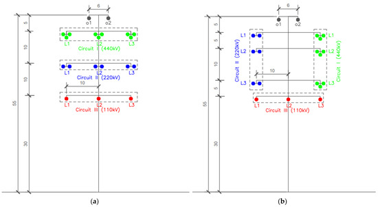 The possible arrangement of the conductors in the line: (a) a horizontal of the phase conductor configuration of transmission line; (b) vertical and horizontal of the phase conductor configuration of transmission line.