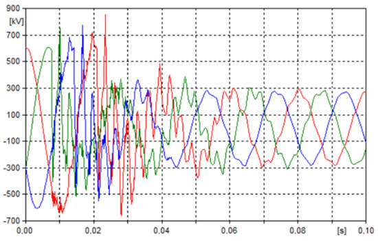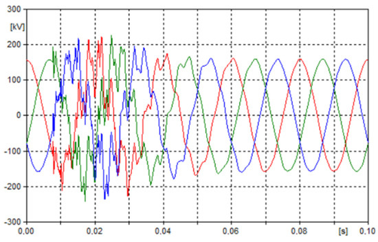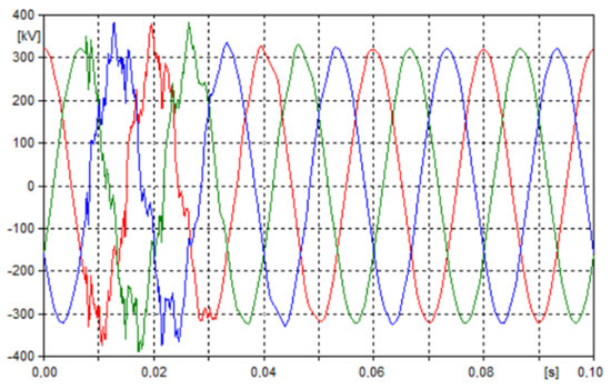 Figure 5, Figure 6, Figure 7 and Figure 8 show transients for current and voltage in the damaged and “healthy” phases of multi-system lines with different voltage levels. Selected voltage transients shown in Figure 6, Figure 7 and Figure 8, respectively, are presented at the beginning of the 110 kV, 220 kV and 400 kV lines (point WE1A, WE2A and WE3A), during a three-phase non-simultaneous short-circuit at the end of the voltage of 400 kV line (point WY1B).