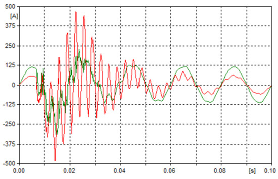 Interconnection failures in multi-system transmission lines are dangerous. Faults appearing in this type of solution, such as, e.g., a break of one phase with a given rated voltage, may affect the occurrence of overvoltages in neighboring systems. Thus, a polyphase short circuit can occur with or without grounding. It should be noted that during such a short circuit, extreme current values appear. This phenomenon is particularly evident in lines with a lower rated voltage level for the current path located on the same support structure. This situation is shown in Figure 9.