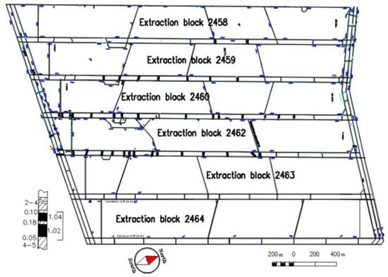 The layout of the mine workings in the Boldyrevsky Seam is provided in Figure 1. The extraction blocks 2458, 2459, 2460, and 2462 were mined out in recent years; extraction blocks 2463 and 2464 have been in operation during 2019–2021. In blocks 2458, 2459, 2460, and 2462, the standard technique, i.e., in-seam gas drainage from development headings, was applied as a baseline scheme since it has been well proven in the mines of Russia. The parameters of this standard technology are set out in the current guideline document: Gas Drainage Instructions [25].