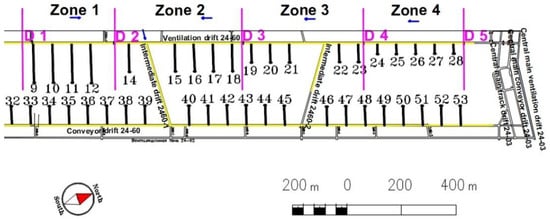 As shown in Table 1, four zones were laid out in the extraction block 2460, where in-seam gas drainage was performed by underground hydraulic fracturing through wells with various effective lengths (i.e., lengths of the open/uncased part of the borehole). In the first group of wells No. 9–13 (zone 1 in Figure 2), the effective length of the hydraulic fracturing wells was 110 m; in the second group of wells No. 14–18 (zone 2 in Figure 2), this parameter was 70 m; in the third group of wells No. 19–23 (zone 3 in Figure 2), it was 35 m; and in the fourth group of wells No. 24–28 (zone 4 in Figure 2), it was 5 m, respectively.
