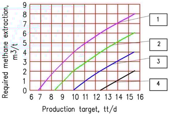 Selection of the viable in-seam gas drainage technology for individual geological and mining conditions is one of the most challenging issues. The key point here is the magnitude of the “gas barrier”; hence, adequate in-seam gas drainage effectiveness shall be defined. The nomogram on the required methane extraction as a result of in-seam gas drainage in the Boldyrevsky coal seam is shown in Figure 4 and allows us to make an adequate decision about the in-seam gas drainage option depending on the required output of the production face.