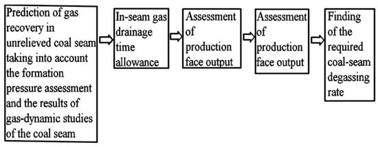 Based on the results obtained, recommendations were drafted on the selection of in-seam gas drainage methods for high-production mining panels, including two phases. At the first stage of drafting recommendations, the required performance of in-seam gas drainage is determined where the predicted gas yield, the time available for in-seam gas drainage, and the scheduled face output are taken into account (Figure 5).
