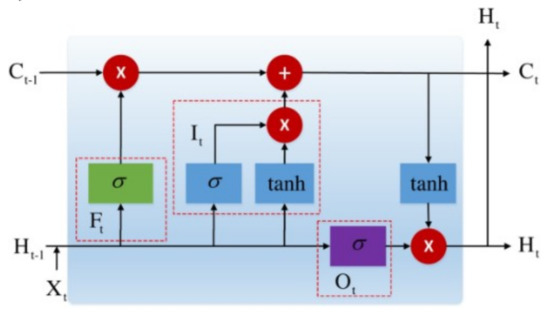 Figure 1 depicts the basic LSTM cell with three gates in a memory cell. The function of input gates is to keep track of the most recent information in a memory cell; the output gate function is to maintain control over the dissemination of the most up-to-date information throughout the remainder of the networks. The third gates (forget gates) function is to determine if the information should be deleted based on the status of the preceding cell. The equations below (8)–(15) explain how to implement and update the LSTM cell state and compute the LSTM outputs.
