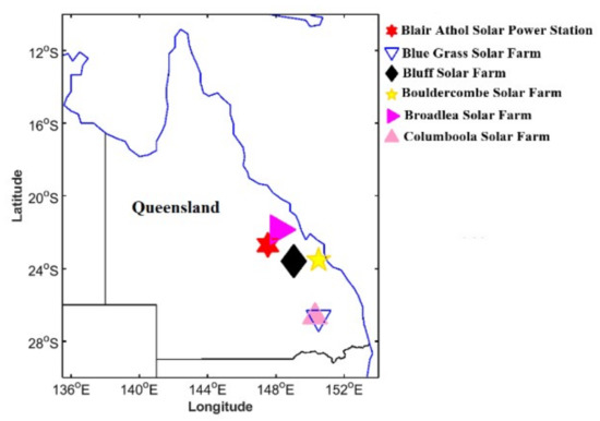 - List of Solar Farms in Queensland—Wikipedia. 2021. Available online: https://en.wikipedia.org/wiki/List_of_solar_farms_in_Queensland (accessed on 1 December 2021).