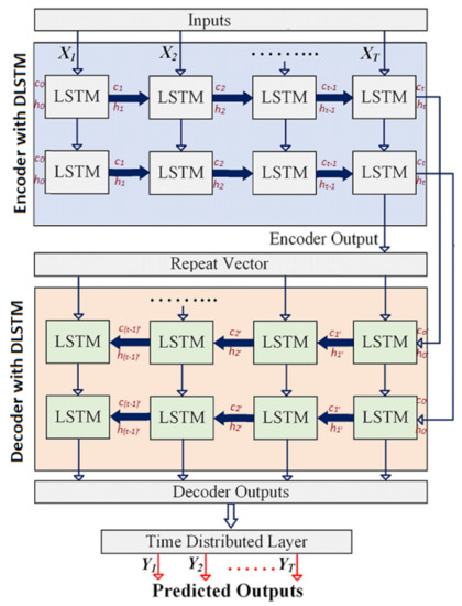 Similarly, to maintain one-to-one relationships on input and output, we have employed a wrapper layer called a time-distributed dense layer. Furthermore, the flattened output of the decoder is mixed with the time steps if a time-distributed dense layer is not utilized for sequential data. However, if this layer is used, the output for each time step is received individually. In particular, the LSTM encoder extracts features from predictor variables and then passes on the hidden state of its last time step to the LSTM decoder. Each output time step contains the future variables. The LSTM decoder output is transformed directly by a fully connected time-wrapped layer to predict output at each subsequent step. The proposed methodology step-wise is shown in Figure 5.