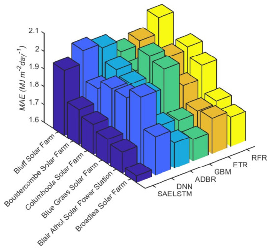 Table 3 reveals that the optimal set of meteorological predictors are somewhat site-specific as the MRFO feature selection method selects different predictors for the different study sites. For example, 16 predictors (in a different order) are selected for the Blair Athol solar power station, whereas for the Blue Grass solar farm, there are 17 predictors, and for the Bluff Solar Farm, we have 16 best predictors. Interestingly, for the Broadlea solar farm, the MRFO feature selection process resulted in 13 meteorological predictors, and for the Columboola solar farm, there were 17 predictor variables—again in different order or predictor type. While the exact cause of these diverse list of screened predictors is not clear, it is possible that the strength of the features related to the measured GSR are different for the different study sites.
