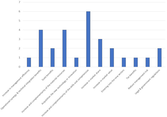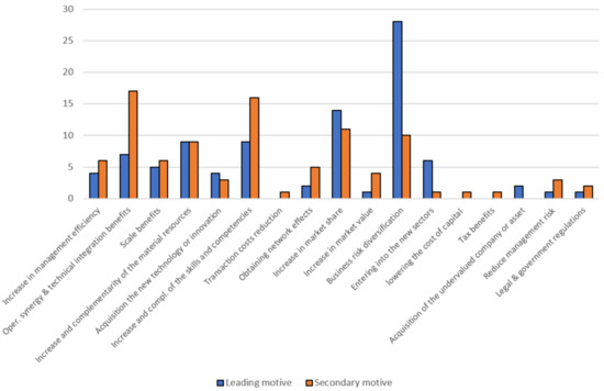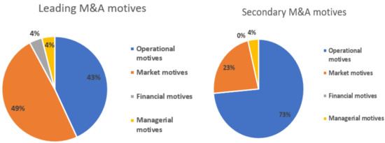 The M&A motives presented in the previous part of this paper were classified into specific M&A motive categories, as presented in Section 3. The operational motives refer to operational activities conducted by the company. Market motives are related to the competitive position of the company in the sector. Financial motives include taking advantage of the current, good financial position of the company, and the opportunity to acquire undervalued assets or to get bargain power in relation to getting funding with better conditions. Managerial motives usually refer to the personal motives of the senior management of the acquiring company.
