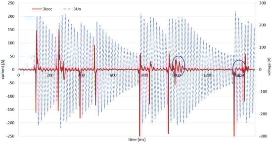 Transient earth faults are characterized by the dynamic and short rise of current amplitude and distortion of the voltage waveform. The transient earth faults may last just a few ms and stop or be reignited after a short time. Figure 1 presents an exemplary sequence of an intermittent fault—10 earth faults are observed one after another, which were initiated and extinguished in a very short time in most cases before steady state earth fault current can be observed. In two cases marked with a blue ellipse, one can notice the steady state earth fault current. One can notice high peak currents during the initiation of the earth fault up to 250 Amps. After each earth fault, the zero-sequence voltage is decreasing and is coming back to nominal values. The slow process of voltage recovery can be explained by the neutral point treatment method—the Petersen coil (capacitive current of the network 80 A, detuning factor 1.15 and shunt resistor with nominal current 20 A). The short-lived IEF are typically not analyzed or categorized because of lack of proper methods, whereas very frequently reigniting transient earth faults are detected by conventional earth fault protection methods—using the moving average tool when the time between the occurrence of IEF is very short and the IEF occur for a prolonged time []. Transient earth faults are dangerous as the voltage reaches a high peak—in the range of 2.5 to 4 times of nominal voltage depending on neutral point treatment []. After the earth fault is terminated, the process of voltage recovery is started. Voltage in the phase under phase to earth fault is rising and voltage in 2 other—‘healthy’ phases is reduced []. In the case of resistor earthed networks, the voltage recovery is practically instantaneous, whereas, in the compensated network, the voltage recovery may last for a few tens of seconds to tens of seconds. Shunt resistor effectively reduces the time of voltage recovery and the voltage recovery lasts a few tens of seconds to a few seconds [,]. The amplitude of earth fault current and voltage— and —strongly depends on the parameters of the network—capacitive current, neutral point treatment, fault impedance and moment of earth fault occurrence [].