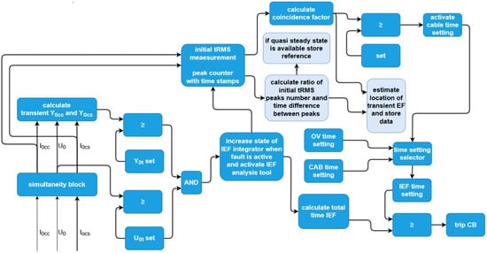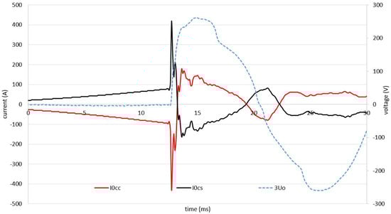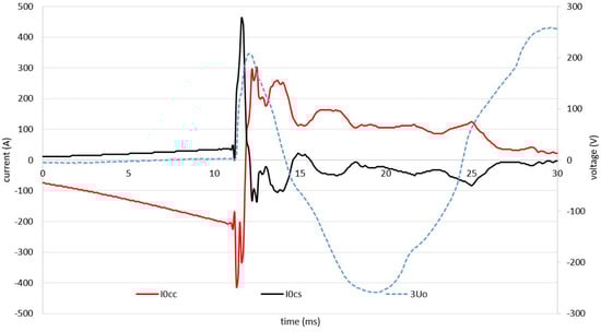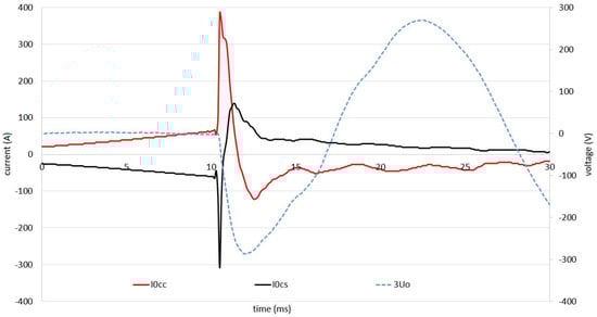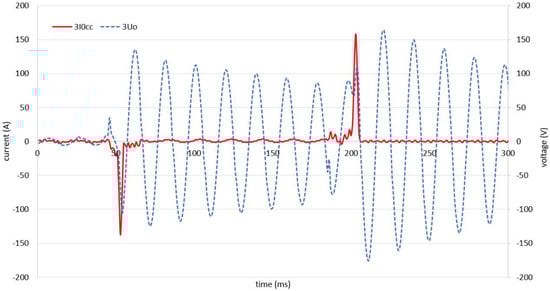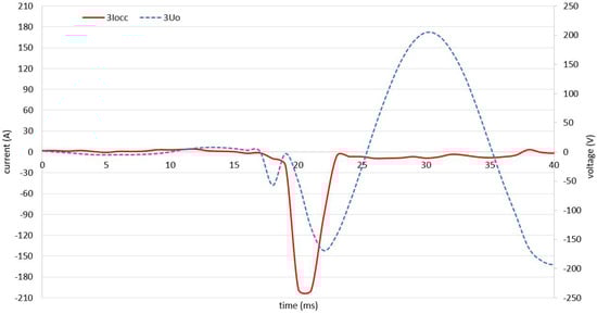 Detection of the transient earth faults is achieved via monitoring of the transient admittance or . Utilization of admittance eliminates the risk of unwanted operation of protection relay as in some cases zero-sequence current can be observed under different disturbance conditions, e.g., transformer energizing []. Additionally, to reduce the risk of unwanted earth fault protection, one can utilize another criterion for earth fault detection—>, which is typically set in the range of 10 V (at the secondary side of open delta voltage transformers).