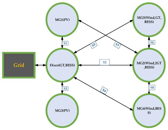 - Javanmard, B.; Tabrizian, M.; Ansarian, M.; Ahmarinejad, A. Energy management of multi-microgrids based on game theory approach in the presence of demand response programs, energy storage systems and renewable energy resources. J. Energy Storage 2021, 42, 102971. [Google Scholar] [CrossRef]