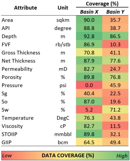 Attributes used in this study and their % data coverage across Basin X and Basin Y.