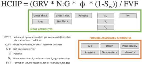 The Hydrocarbons Initially In Place (HCIIP) calculation and relevant attributes within the datasets. Primary attributes directly feed into the HCIIP calculation. Six additional attributes are identified as likely to show some dependency to the HCIIP attributes.