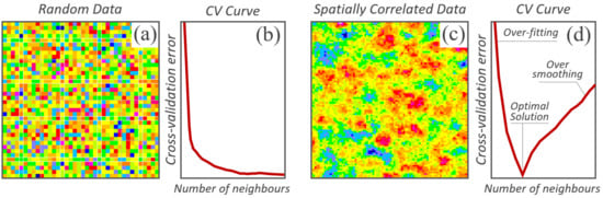 Figure 4. Feature selection with KNN: (a) uncorrelated (random) data pattern; (b) associated cross-validation error curve steadily declining for uncorrelated data; (c) spatially correlated data; (d) cross-validation error featuring a distinct minimum for correlated data (after []). - 5.