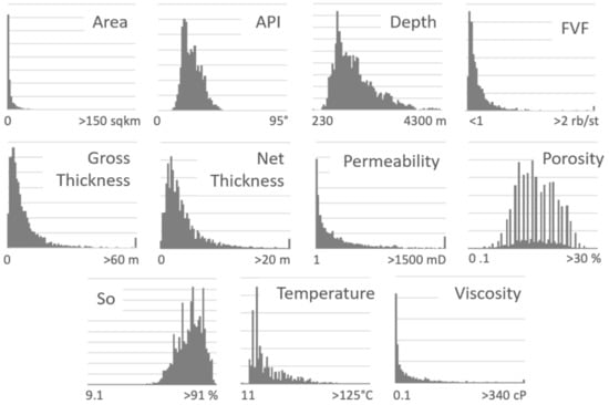 Exploratory data analysis uses several data visualisation methods to support a quick evaluation of data distribution statistically across multiple attributes. This approach checks for outliers in the data and provides a quality check for appropriate ranges of variables. Histograms of the input attributes in Basin X (Figure 6) show close to normal or slightly skewed distributions for API, depth, porosity and saturation. Other attributes show a heavily skewed data distribution with possible outliers, for example, area, net thickness, gross thickness and viscosity (Figure 6). The porosity, temperature and saturation data distributions indicate that the dataset used a mixture of integer and decimal data, and therefore does not show a smooth normal distribution (Figure 6).
