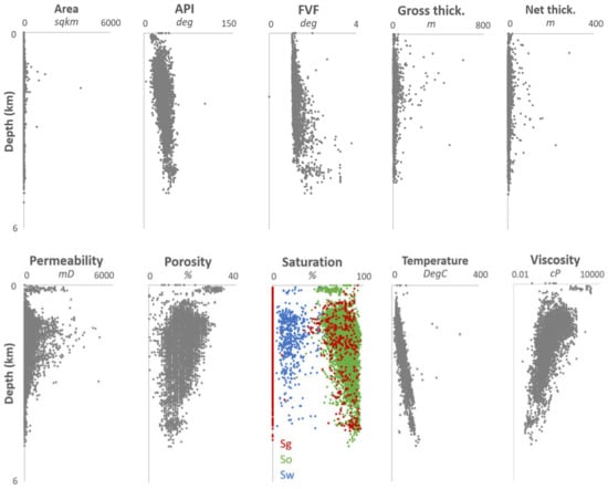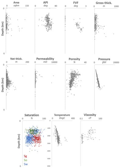 Data visualisation is a powerful tool to allow the geoscientist to assess the data quickly and efficiently and explore if data outliers are geologically valid or erroneous. Understanding data distribution may also identify unexpected areas of low (or high) coverage where data are absent or incorrect. We demonstrate that data visualisation in multi-dimensional space is beneficial for understanding data distribution, including outliers, and can inform inputs to stochastic simulation when calculating reserves. This data-driven approach could allow for a better quantification of subsurface uncertainty and economic risk in exploration and production []. Finally, increasing attribute coverage in large datasets can aid all aspects of the petroleum value chain from exploration, appraisal, development, production and enhanced recovery []. For example, increasing temperature coverage can reduce the risk in exploration. Temperature data are often absent or erroneous in legacy wells but are an important input to basin modelling to de-risk source rock generation and charge [].