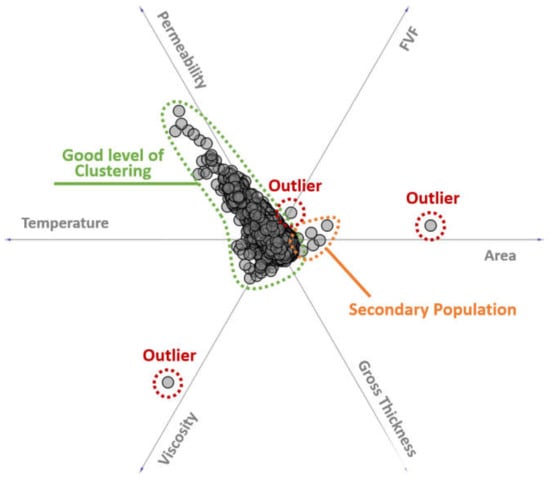 The Basin X data have also been visualised in a multivariant linear projection to assess the relative separation of the outliers (Figure 9). Linear projection is a useful tool for the visualisation of multivariant data in two dimensions [,]. It can be used to visually assess clusters within the data, as well as identify outliers. Here, we use a circular placement which plots attributes on independent vectors []. This allows attributes to be assessed independently and assumes no attribute has a higher importance for clustering (as in principle component analysis). The resulting plot shows that area and viscosity have significant outliers, with likely additional anomalous data points seen in the FVF values (Figure 9). There are indications of multiple data populations, however, the majority of data tend to group into a distinct cluster of values of similar range.