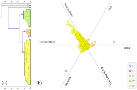 (a) Hierarchical clustering of Basin X data into 5 distinct clusters in 11-dimensional space. (b) Multivariant linear projection of attributes area, FVF, gross thickness, permeability, temperature and viscosity. Colours indicate Clusters C1–C5 and demonstrate that outliers are captured well by hierarchical clustering. Plot from Orange Data Mining software [].