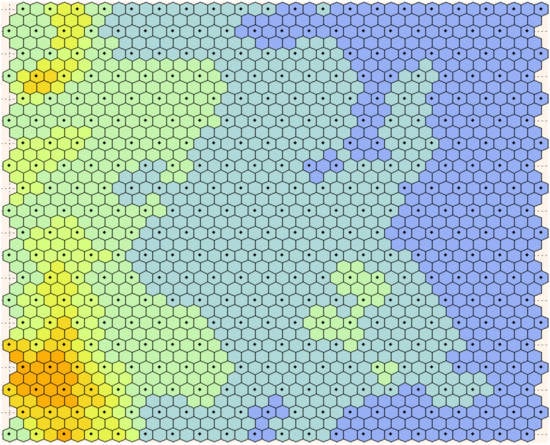 U-matrix for the 11 inputs (shown in Figure 12). Cool colours indicate small distances between data points (clustering), warm colours represent large distances between data in multidimensional space. SOM maps generated in ML Office [].