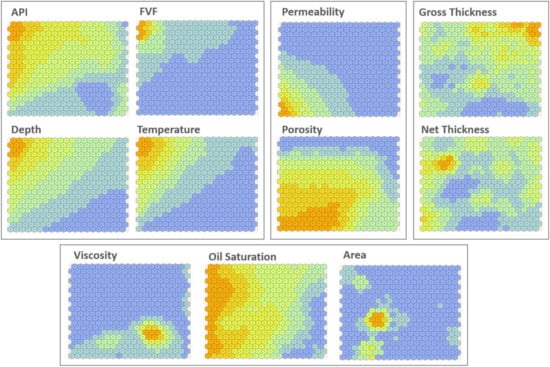 - Grouping similar reservoir and fluid characterisation features. This step identifies groups of reservoir and fluid variables that exhibit similar trends within the data using self-organising maps (SOM) []. This unsupervised learning tool groups attributes showing similar dependencies in a reduced space—a 2D lattice. SOM uses competitive learning to assign the input data to neurons on a lattice as arranged by their similarity. The distances between the data on the 2D lattice are visualised by heat maps, where cool colours indicate small distances between data points (clustering), and warm colours represent large distances between data. Here, we use SOM lattice data projection to generate a heat map for each attribute that depicts mutual relationships between the trends in the data, therefore allowing geological attributes to be grouped based on the trends they exhibit. In this data-driven workflow, this step ensures only those physically meaningful trends are brought forward for predictions. SOM was completed using the software ‘ML Office’ [].