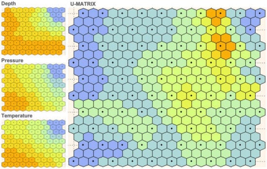 Due to a lack of pressure data in the Basin X dataset, SOMs were constructed for Basin Y for the three attributes depth, temperature and pressure (Figure 13). API, FVF and viscosity have been excluded due to insufficient data coverage hampering the identification of statistically-meaningful dependencies. The resulting U-matrix heat map is not random (Figure 13), indicating that there are dependencies between the variables present in the dataset. Nevertheless, it is challenging to identify the number of possible clusters based on visual inspection of the U-matrix map. Heat maps of the three input layers show similar distributions, with clustering occurring in the top right of the input layer, with increasing separation of data points towards the bottom left of the input heat map (Figure 13).