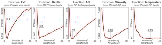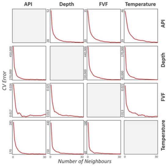 - API: The CV error minimum corresponds to K = 5 neighbours with FVF and temperature as the inputs (Figure 15a). An increasing CV error with increasing neighbours indicates a level of predictability based on the clustering of these data. Other combinations—FVF and depth, depth and temperature, show little relevancy to predict API with no apparent minima on the error curve (Figure 15a). This suggests that depth has little relevance to API values in this reservoir dataset.