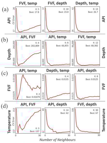 KNN cross-validation (CV) error curves for each variable in three-dimensional space. The input features are listed on the horizontal axis, and the target variable listed on the vertical where: (a) API; (b) depth; (c) FVF; (d) temperature. Where the error curve (red) has a declining shape with increasing number of neighbours (x-axis), the target variable does not depend on the distance between the input data and is therefore not relevant to input features. An error curve that features a distinct minimum corresponds to a KNN estimate for data that can be spatially correlated.